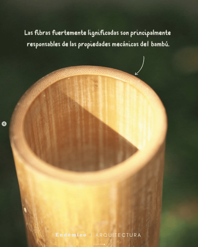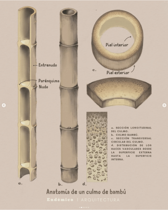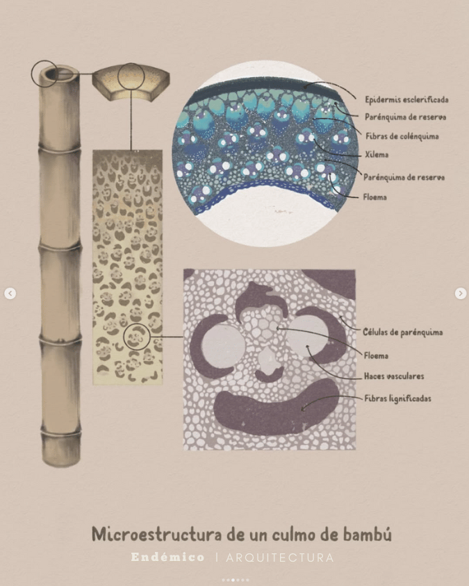 A nivel microscópico, el bambú está compuesto principalmente por celulosa, hemicelulosa y lignina. La celulosa le da flexibilidad y resistencia a la tracción, mientras que la lignina actúa como un polímero estructural que endurece las paredes celulares, permitiendo que el bambú resista grandes cargas sin deformarse. Su estructura interna está formada por haces vasculares dispersos en una matriz de parénquima. A diferencia de los árboles, donde los anillos de crecimiento concentran la resistencia en capas, en el bambú estos haces vasculares se distribuyen de manera estratégica, con una mayor densidad en la periferia del culmo, creando un efecto similar a un tubo reforzado en los bordes.