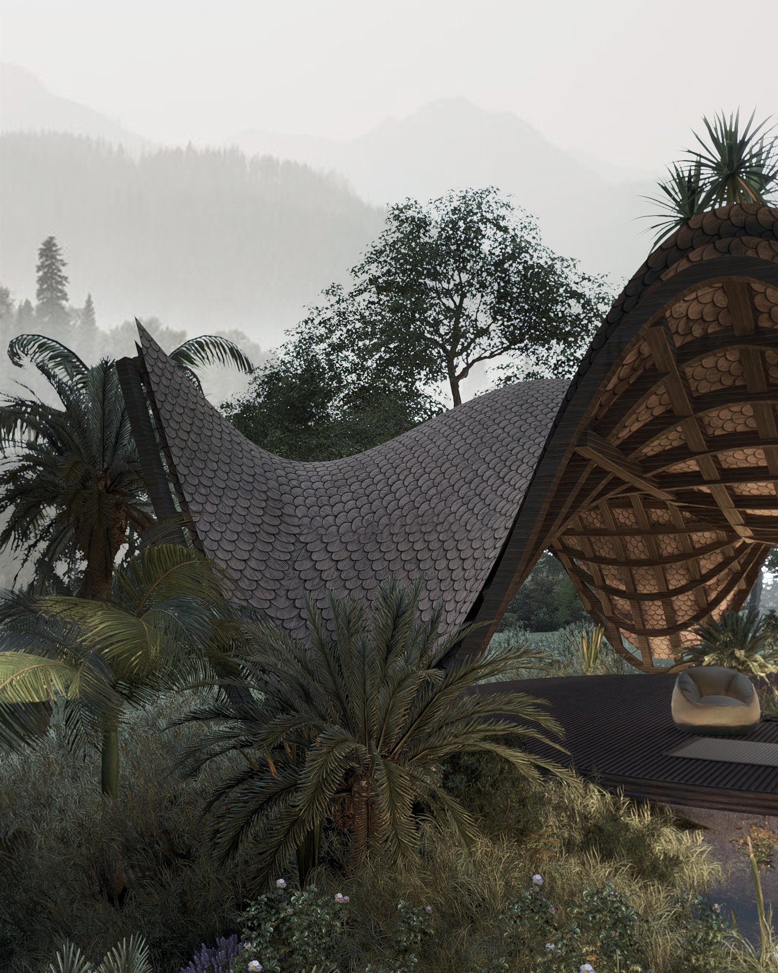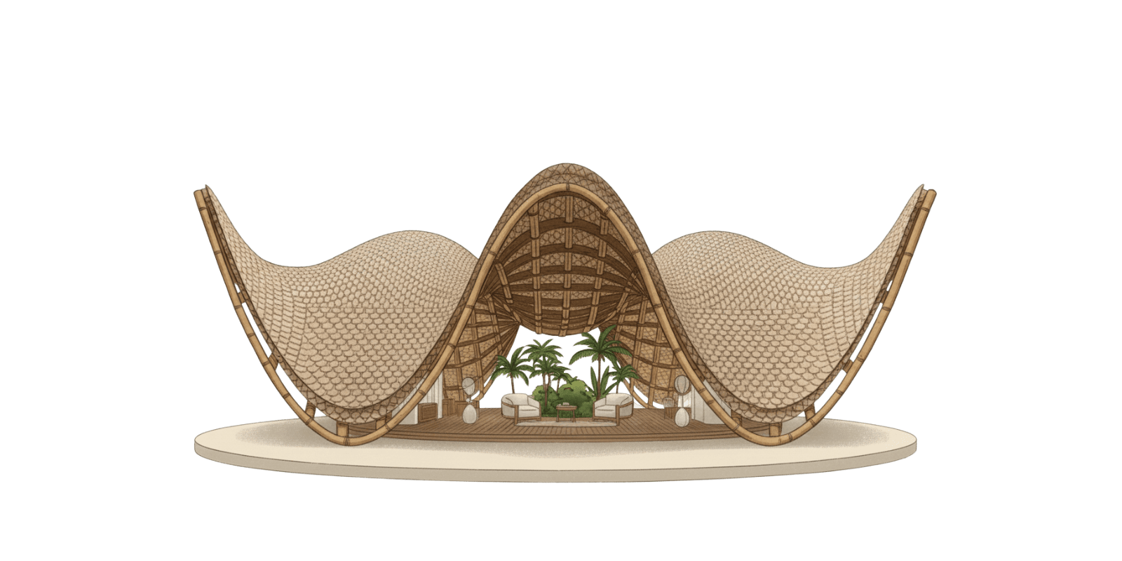 Este espacio marca el inicio del recorrido con un gesto amplio y ligero. La cubierta se extiende hacia el paisaje y crea un umbral permeable con el paisaje. Respirar antes de entrar al resto del lugar.