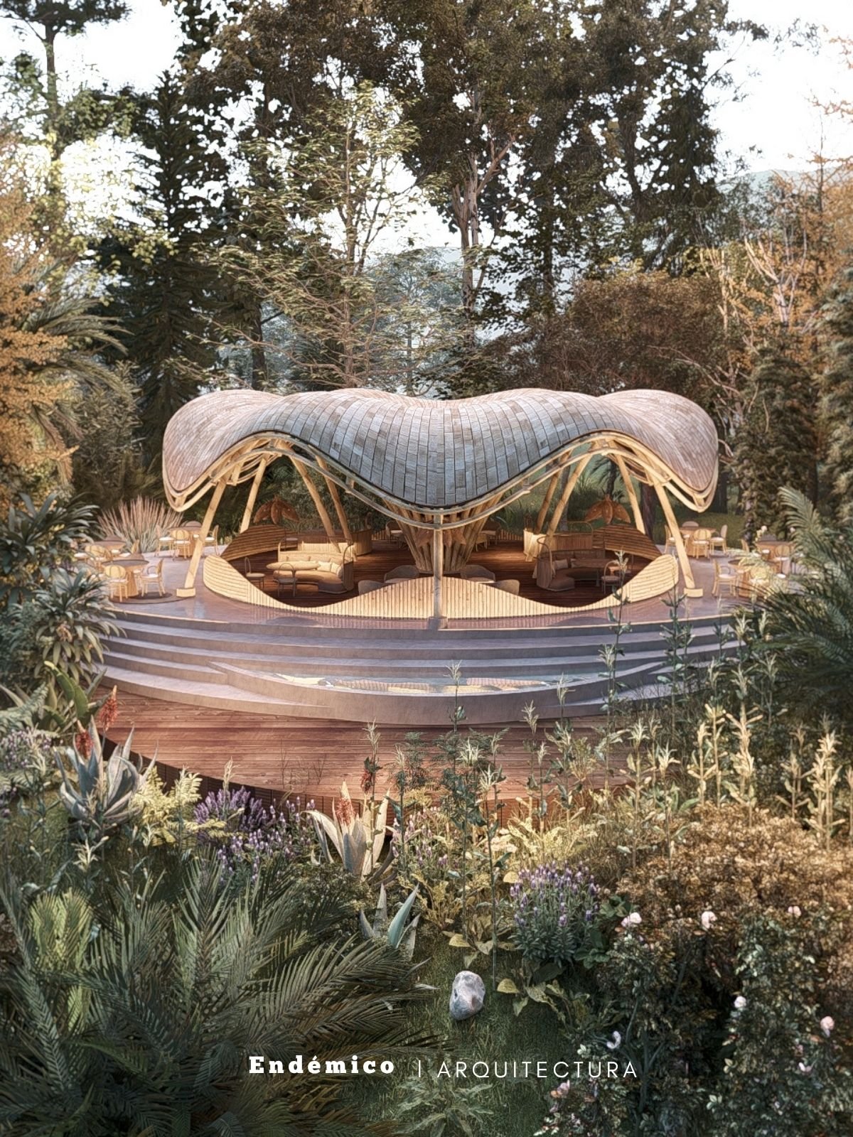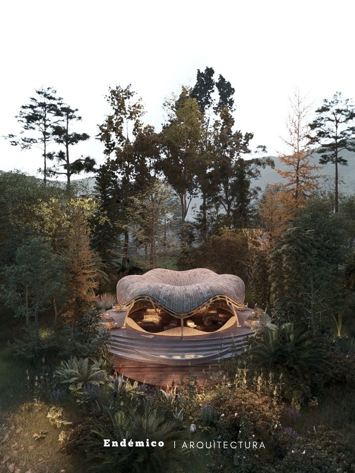 Un pequeño observatorio natural. Su forma compacta, inspirada en la estructura protectora de una semilla, crea un espacio interior cálido que mantiene una relación constante pero controlada con el exterior.