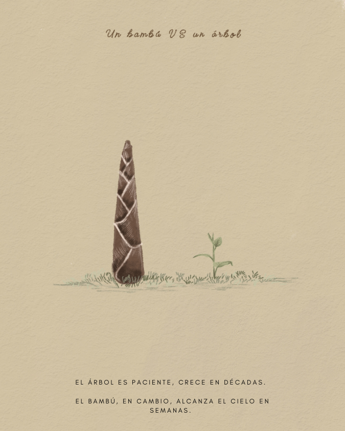 🎋 Bambú: Crece extremadamente rápido, algunas especies pueden crecer hasta 1 metro al día. Alcanza la madurez en 3 a 6 años.
