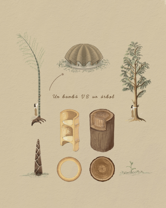 🌳Árbol: Los árboles también secuestran carbono y ofrecen importantes beneficios ambientales, pero su ciclo de vida más largo y crecimiento más lento los hacen menos eficientes en comparación con el bambú en términos de captura de carbono en un período corto.